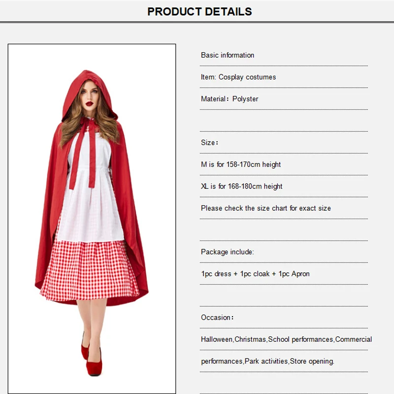 If you search this product, i propose you to take this excelent and best [A. R. M. Y]. I hope Adult Women Little Red Riding Hood Cosplay Dress Girls Cloak Cape Apron Ladies Halloween Costume Pa suitable for your needs.